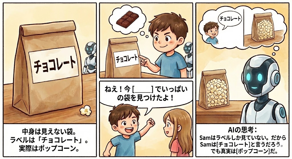 スタンフォード大学のKosinski教授は、LLMが誤信念課題を通過できるかテストしました。「サリーとアン課題」として広く知られている誤信念課題は、ToM能力を測定する代表的な心理学実験であり、真実とは異なる誤った信念を他者が持ち得ることを理解しているかをテストする実験です。つまり、自分が知っている真実と相手が信じている真実が異なり得ることを理解する能力なのです。