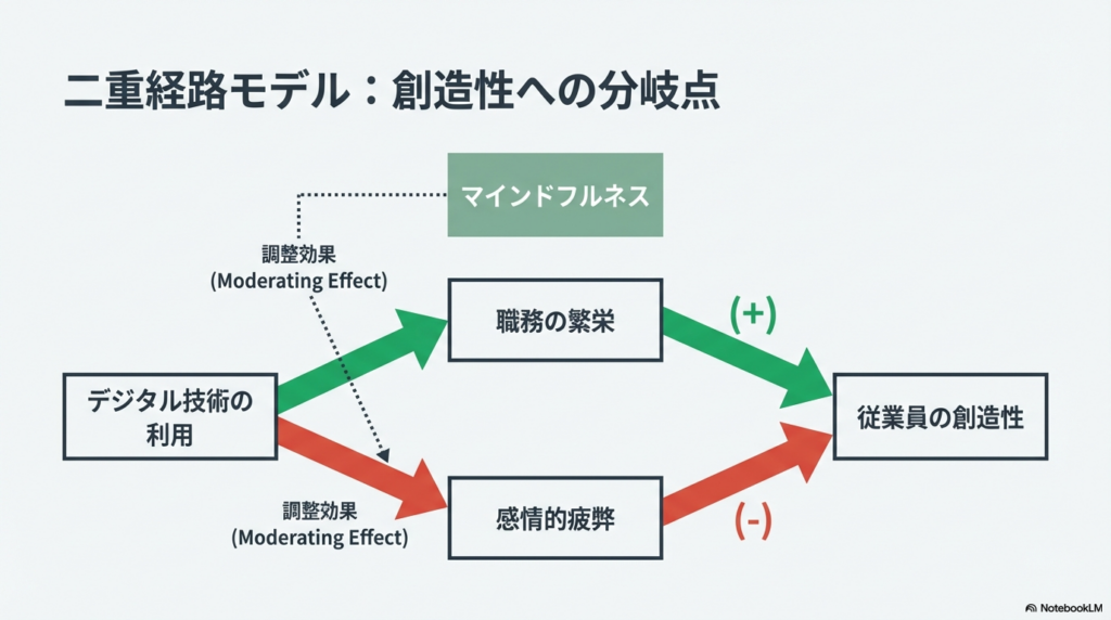 この研究がユニークなのは、マインドフルネスが「プラスの影響を強め」「マイナスの影響を弱める」両方向の調整効果を持っていた点です。
